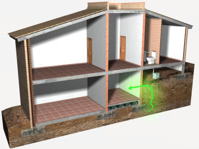 | Barrière anti-radon du côté extérieur d'un mur en béton en contact avec le terrain, avec des complexes multicouches. | ||